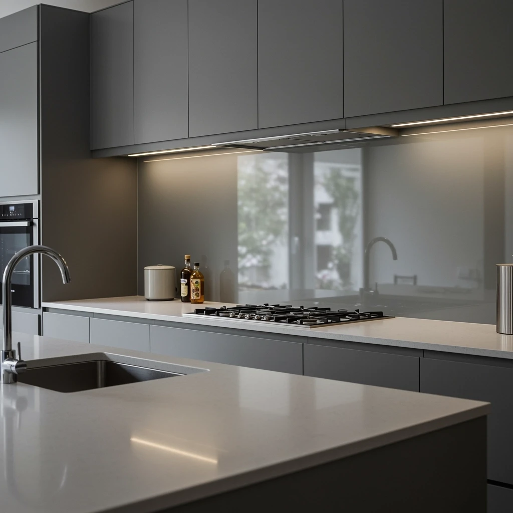 Tempered or back-painted glass backsplashes offering modern aesthetics and easy maintenance.